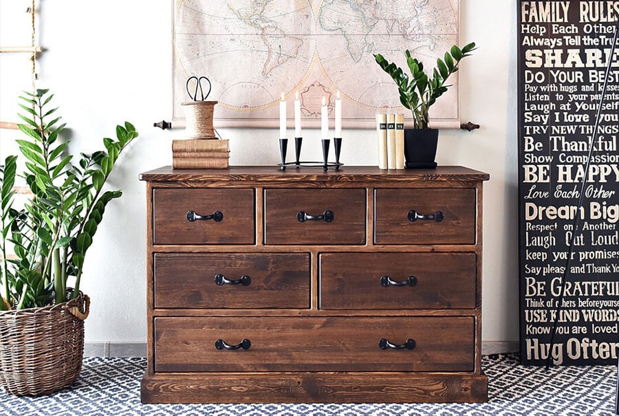 Jestliže vám prostory dovolují, vybrali jsme pro vás šestizásuvkovou komodu vyrobenou z masivního borovicového dřeva, ošetřenou přírodním voskem v tmavé barvě. Komoda se bude nádherně vyjímat u okna, ozdobená uměleckým dílem a nádherným kovovým svícnem.