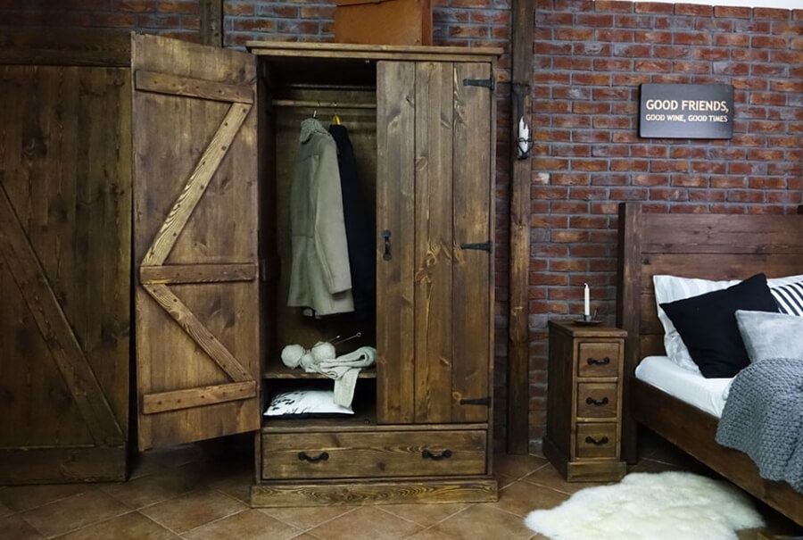 Když oblékáte ložnici nový rustikální kabátek, myslete na to, že nábytek hraje nepostradatelnou roli. Dbejte na to, abyste nevybočovali z řady, ale stále se drželi elegantního a hřejivého nábytku. Nezapomínejte, že vaší představou není vytvoření minimalistického stylu a vzdušnosti, ale takového stylu, který zahřeje u srdce svou sílou přírody a zároveň půjde v čele s minulostí. Vhodné jsou velké a robustní kusy nábytku. Zejména masivní skříň, noční stolky a robustní postelový rám.